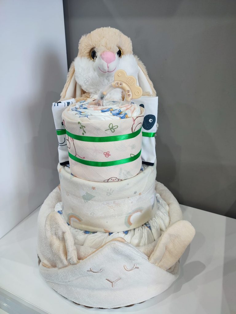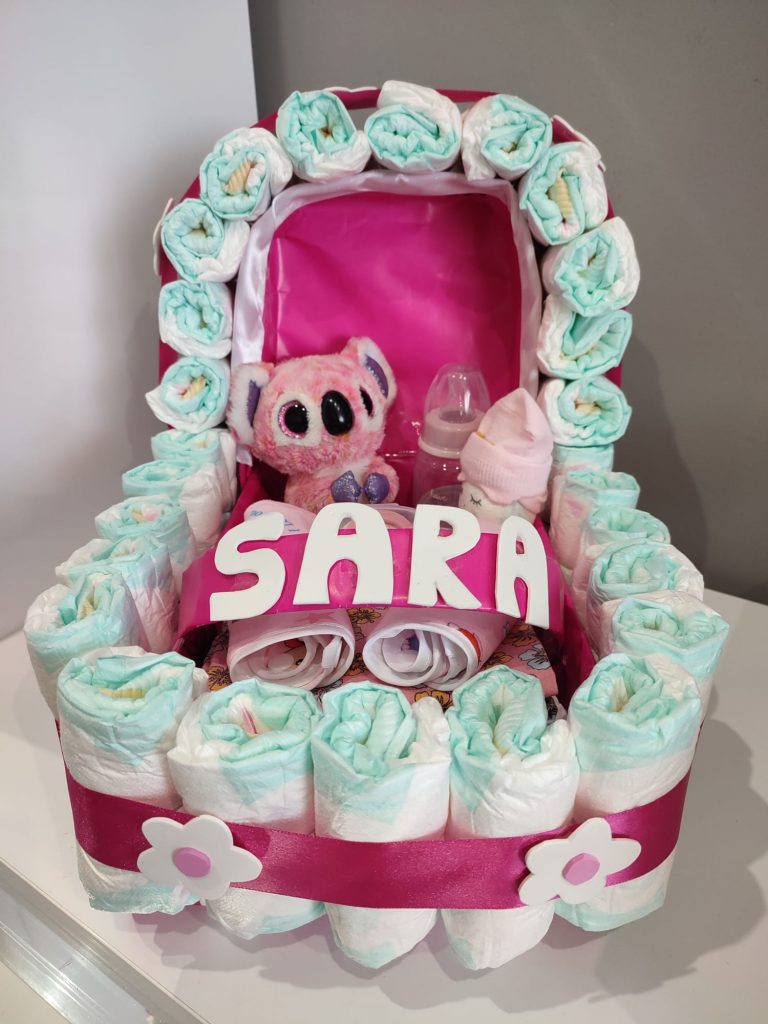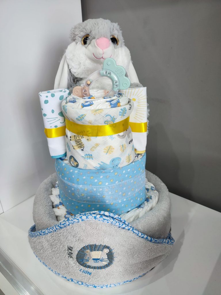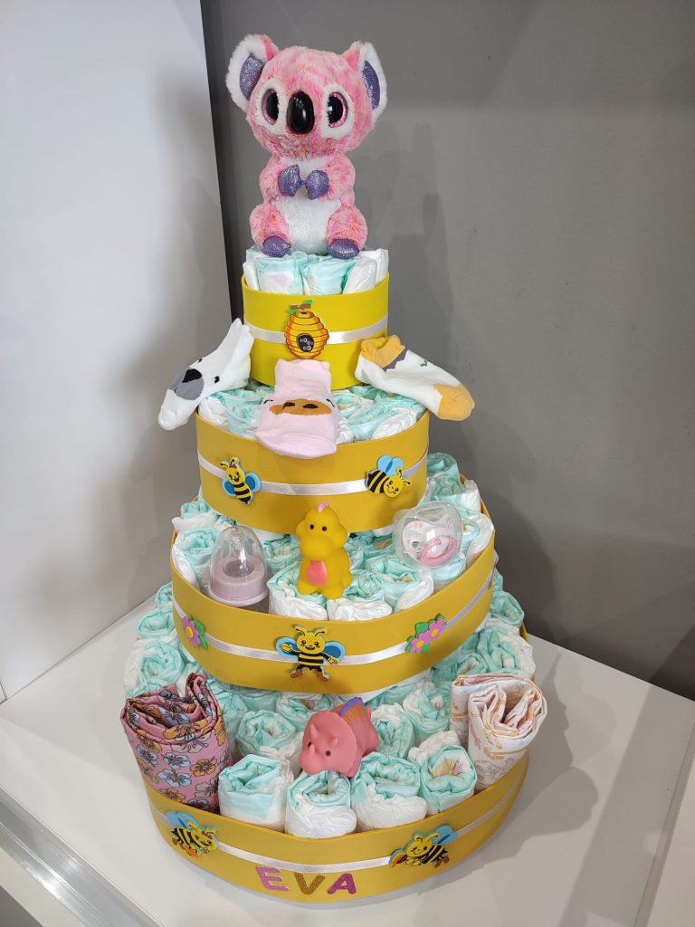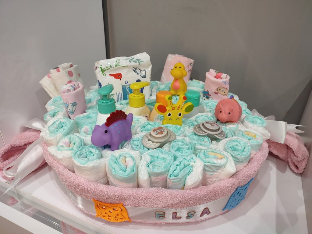 – Tartas de pañales (consultar precio). Si lo que vas a celebrar es una babyshower, no te preocupes por el regalo. Nosotros te hacemos tartas de pañales al gusto, del color, forma y tamaño que desees, con todo lo que quieras incluir en ella.